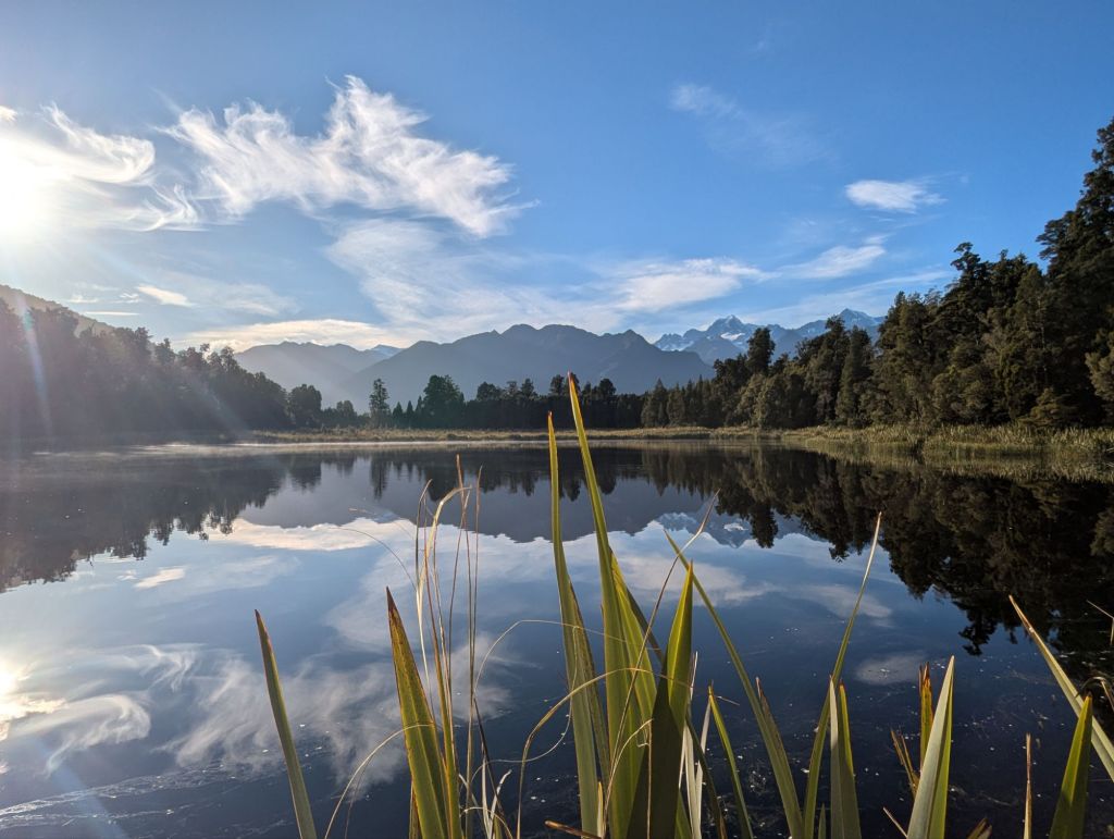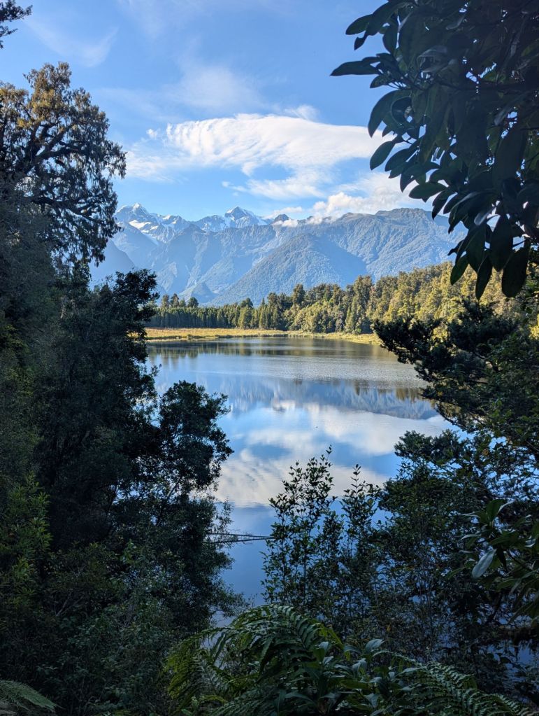 Yet another sunny morning greeted us in Franz Josef as we boarded the trusty van for a trip to Lake Matheson. A short 2 mi. walk around the lake provided stunning views of Mt Tasman and Mt Cook from a different angle than previously (now looking south). The lake suffered from Canada goose congestion but the mirrored views were fantastic. We enjoyed a short coffee stop at the gift shop and then moved on to Lake Wanaka. It was a fairly long drive up and down through the mountain passes with few stops to view a couple of the many waterfalls along the way. There were plenty of pulloffs for our polite driver to allow faster vehicles to pass, apologizing to Greg at each one. “Sorry, Greg” for the guy who had expressed impatience at NZ courtesy. Many many more one lane bridges were crossed on these highways. We passed by Haast on the West Coast where we lunched on the beach, then through Makarora and along Lake Wanaka and over the mountain pass/isthmus to Lake Hawea and back along Lake Wanaka at its southern end to Wanaka. More sheep and cattle grazed roadside. Wanaka was very trendy, a smaller version of Queenstown, with boutiques, athleisure, and souvenir shops amongst the many, many eateries and drinkeries along the shore of expansive Lake Wanaka. The crowds here seemed very young and everyone was enjoying outdoor drinks making me wonder “does anyone here work?”. We stayed at our hotel, Edgewater, a short 30 min walk from town. Greg and I had taken some time to stroll through town on arrival with a visit to a wine bar, bringing the average population’s age up a bit. Dinner was at the hotel once again.