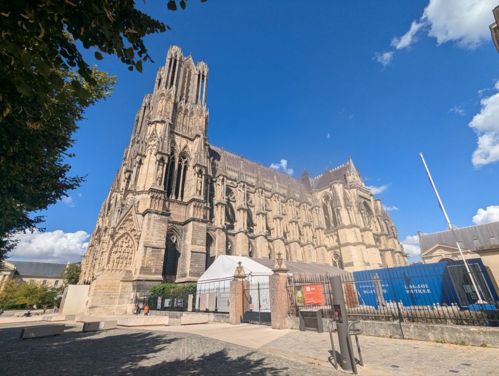 Automobile and driving specifics aside, we headed north east 2 hours to Reims (pronounced “Rance” with nasal emphasis on ‘an’). In Gaul, this would have been “Belgica” but is now known as the Champagne region. Once out of Paris and its surrounds the landscape opened up to rolling green and gold pastures, some fields harvested and others with waving stalks of mature corn or wheat. Even from a distance we could see the cathedral as we approached Reims. A smallish city of about 200,000 pop., Reims has ancient Roman beginnings and continued significance in history as the place where Frankish/French kings were coronated from when the first king, King Clovis, was baptized in 496AD here to where General Eisenhower and the Allies received the unconditional surrender of the Wehrmacht in 1945.