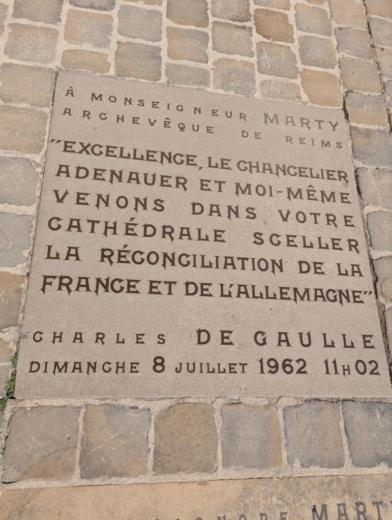 The cathedral Notre Dame de Reims is fantastic in size, decoration, and history. Most recently, well, relatively compared with the Romans and Gaul or 11th century coronations, the Notre Dame cathedral was severely damaged in WW1 by German bombing which reinforced anti-German propaganda. Post-war restoration was significantly funded by American John D. Rockefeller. The results are stunning; the highly decorated exterior displaying many statues and sculptures of kings and biblical figures, gargoyles, and wedding cake-like decorations made of mortar or limestone. The soaring ceilings in this Gothic cathedral are lit with mostly clear glass windows, many of the stained glass destroyed in WW1 or removed in the 19th century in an effort to brighten the interior. The area behind the altar has highly stylized stained glass created by Marc Chagall in the 1970s, with elements of Judaic and Christian storytelling. WW2 saw less damage (but still some) to Reims and the cathedral. Gen. Eisenhower received the surrender of Germany here on May 7, 1945, and later, symbolically, Pres. De Gaulle and German chancellor Adenauer signed a document of reconciliation here in 1962.