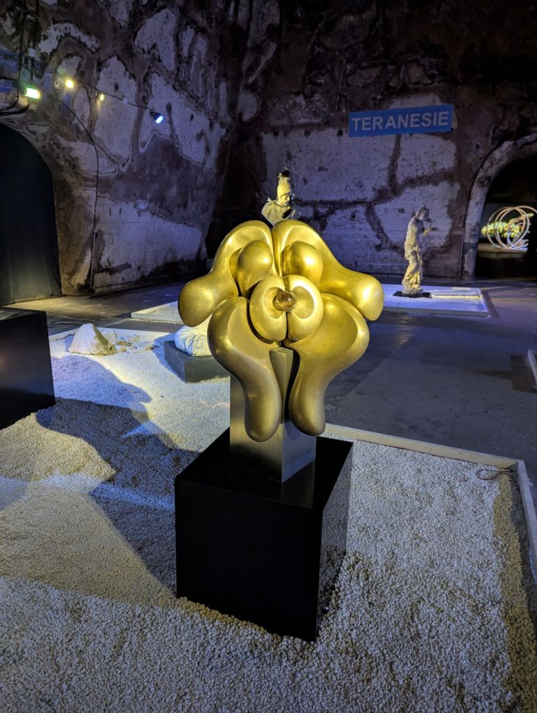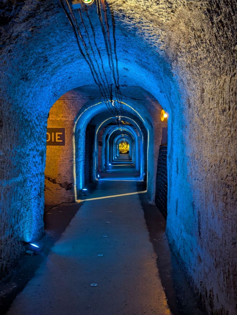 Oh, did I mention champagne? Reims is in the north of the champagne district of France so we were sure to sample the fruits of the region. The next morning, after a lovely breakfast of French breads, cheeses, pastries, omelets, and oui, champagne, we headed over to Vrancken Pommery house to tour the champagne cellars. Madame Pommery oversaw the conversion of local Gallo-Roman chalk caves into champagne cellars in the 19th century. Multi colored lights illuminated 120 steps down 30 m into the 18 km of tunnels now housing 20 million champagne bottles at various stages of fermentation and delightfully, art installations to view and enjoy all along the way. And yes, a champagne tasting at the end of the tour.