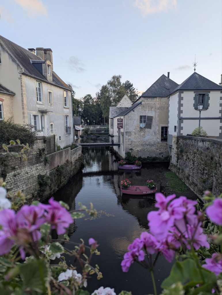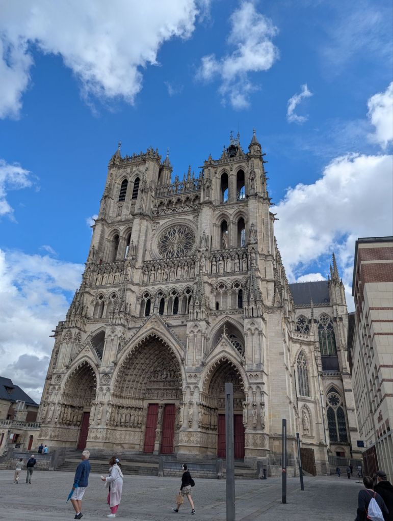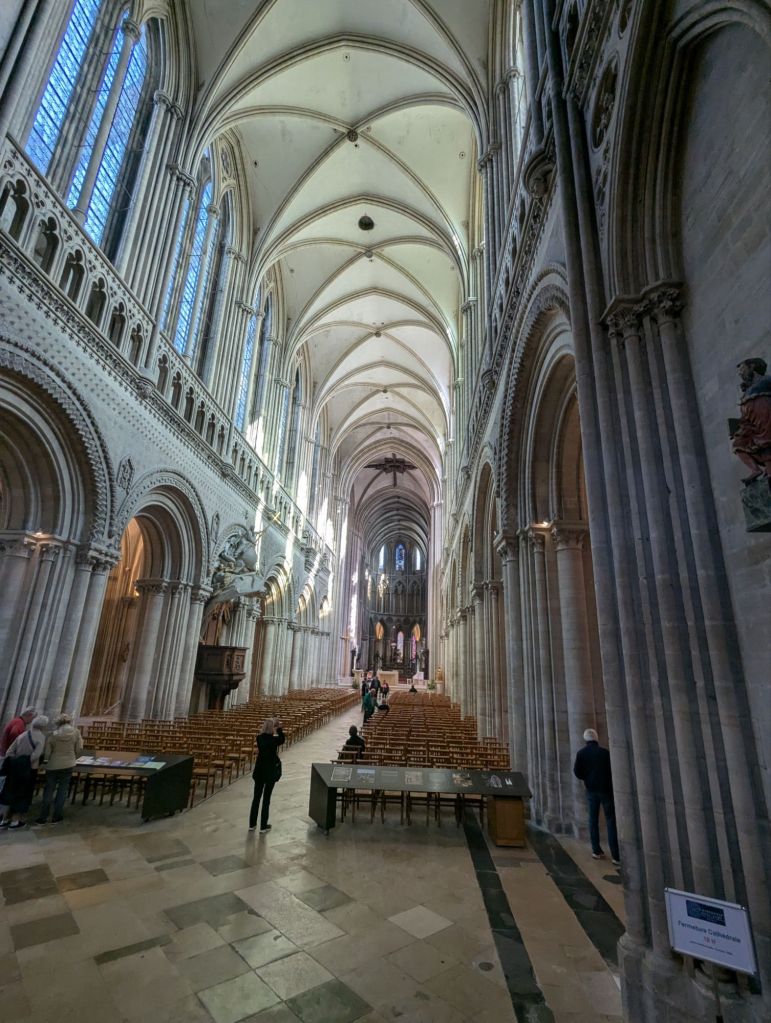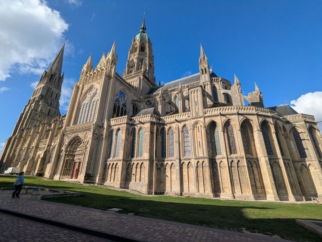 We then headed west towards Amiens, about 2 hours away, to visit Notre Dame d’ Amiens, France’s largest cathedral. The highway was bordered by more idyllic pastures and potato fields dotted with stone houses and barns with red tiled roofs. Stately white, silent windmills spun slowly above. The Gothic cathedral Notre Dame d’Amiens is the largest in France, not as highly decorated or with as much statuary as in Reims, but beautiful with the soaring curved ceilings held up with graceful pillars like trees holding up the sky. Typically in these cathedrals, the main altar and choir are enclosed behind carved wood or stone screens, or roods, but side altars celebrate various saints. A relic of St. John the Baptist is on display in one of them. The organ sits up high in the back, assuming the organist does not have a fear of heights. After our visit we sat across the square at a cafe enjoying the cathedral view and a tea, coffee, or beer. Amiens is Jules Verne’s hometown, btw. Back in our Renault we decided to skip Rouen for now as there was another 3 hours of driving to the next destination, Bayeux, and our hotel, Chateau Carnivere. This chateau is slightly more modest than our last, but has some history as a farm, then Nazi headquarters then British headquarters before eventually becoming a beautiful hotel. The restaurants, les Botaniste and les Petit Jardinere, served fabulous fresh food. My plan is to start out wearing belted slacks and jeans and then switch to elastic waisted pants as the trip proceeds.