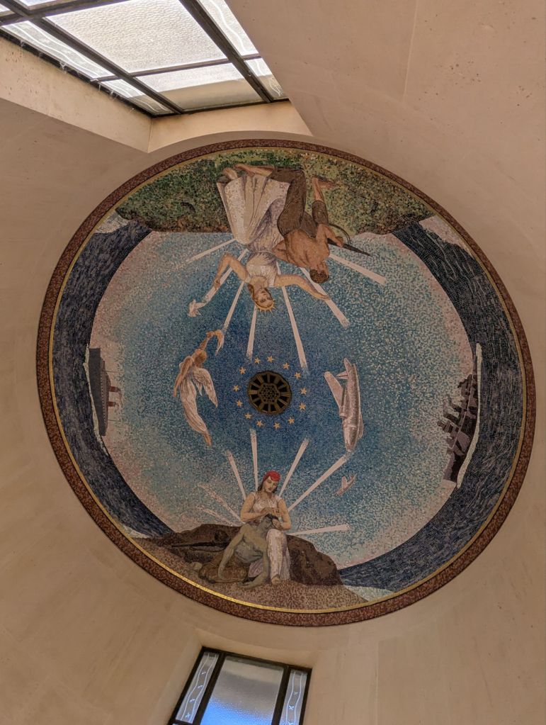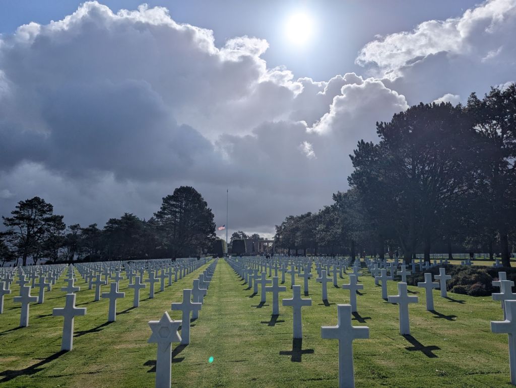 From Omaha we continued to Colleville, the American cemetery. Of 160,000 Allied soldiers that landed on D-Day there were over 10,000 casualties, 6,000 US. Rain had started but by the time we walked the 5 min from the van to the cemetery, sunshine broke out amongst the clouds. Soldiers are buried randomly, and without birthdate, as all are equal in death. The white marble crosses and stars of David gleamed in the sun. A small chapel has a mosaic ceiling of symbolic Columbia leading her boy/man soldier to Marian who will receive him as her own in France. Walking amongst the headstones, 2 French fighter jets flew very low, overhead. It was 9/11, particularly sombre and meaningful.