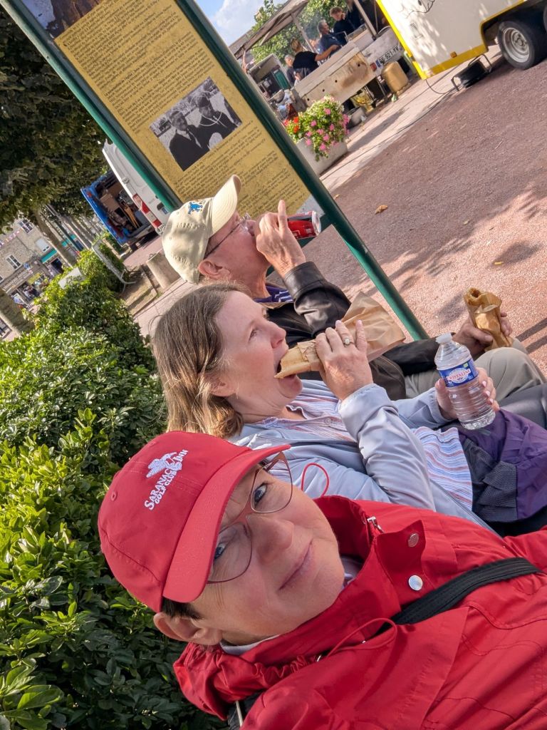 Our tour then took us to Sainte Mere Eglise, the first town liberated on D Day (although other villages claim the same). Paratroopers landed here, near Utah Beach, with the mission of keeping bridges and causeways open. Rommel had flooded the marshes nearby, reversing the mechanisms on the locks that drained the fields. It was important to keep the travel paths clear for troop, artillery, and supply movements for the invasion. One paratrooper, John Steele, got snagged on the spire of the local church, was captured by the Germans, but managed to escape and eventually fought in other battles. There is also a great Airborne Museum here with many war mementos and displays and an original C47 plane and a glider. Also one building housed a simulation of the noise, lights, and reverberations of an attack which was pretty distressing to me. We didn’t have a lot of time to spend there but it’s worth visiting (tell them “Fred” sent you for free entry). We enjoyed a very large grilled sausage sandwich and fries from a food truck at the market in town. Seems that everything closes up from 12:30 or 1:00 to 3:00pm or later (French ‘siesta’?).
