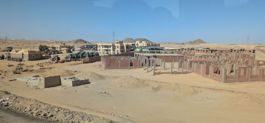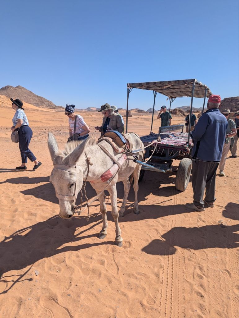 Jumping right into our the trip, we awoke the next morning at 2:30 am for our 6:00 am flight from Cairo to Aswan. We passed multiple security gates for the 1 hour flight to Aswan 500 mi south in Nubia, or “Upper Egypt” (relative to the Nile which flows south to north). From the Aswan airport we were bussed further south through the Sahara desert towards our next destination, Abu Simbel. But first, the 3.5 hr bus ride (175 mi) was mostly quiet on mostly well paved roads allowing tour mates an opportunity to catch up on jetlag. Many overloaded freight trucks heading south to Sudan also shared the road. We passed by mile after mile of sand and barren moonscape littered with rocky rubble and also high tension power lines. Eroded rocky outcroppings made natural pyramids. This was less scenic than I imagined or remembered from the giant dunes in Morocco (northwestern Sahara). Eventually green fields began dotting the mostly flat horizon. What? Egypt is attempting to reclaim the desert, having once been the breadbasket of the Roman Empire. Irrigation canals bring water from Lake Nasser, 50 km away. The government offers land to intrepid farmers willing to give it a go and also there is a giant military farming installation. Midway, we stopped at a rustic (I’m being generous) rest stop and while reboarding saw combines harvesting grain or corn in the distance. Combines in the Sahara!!! Go figure!