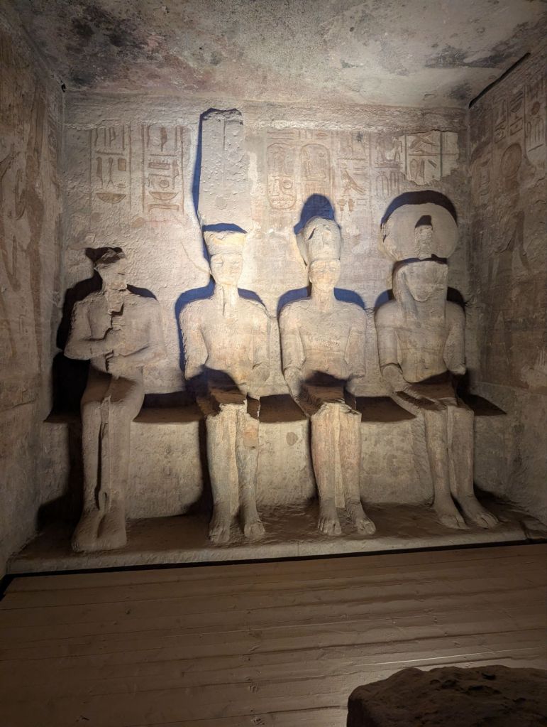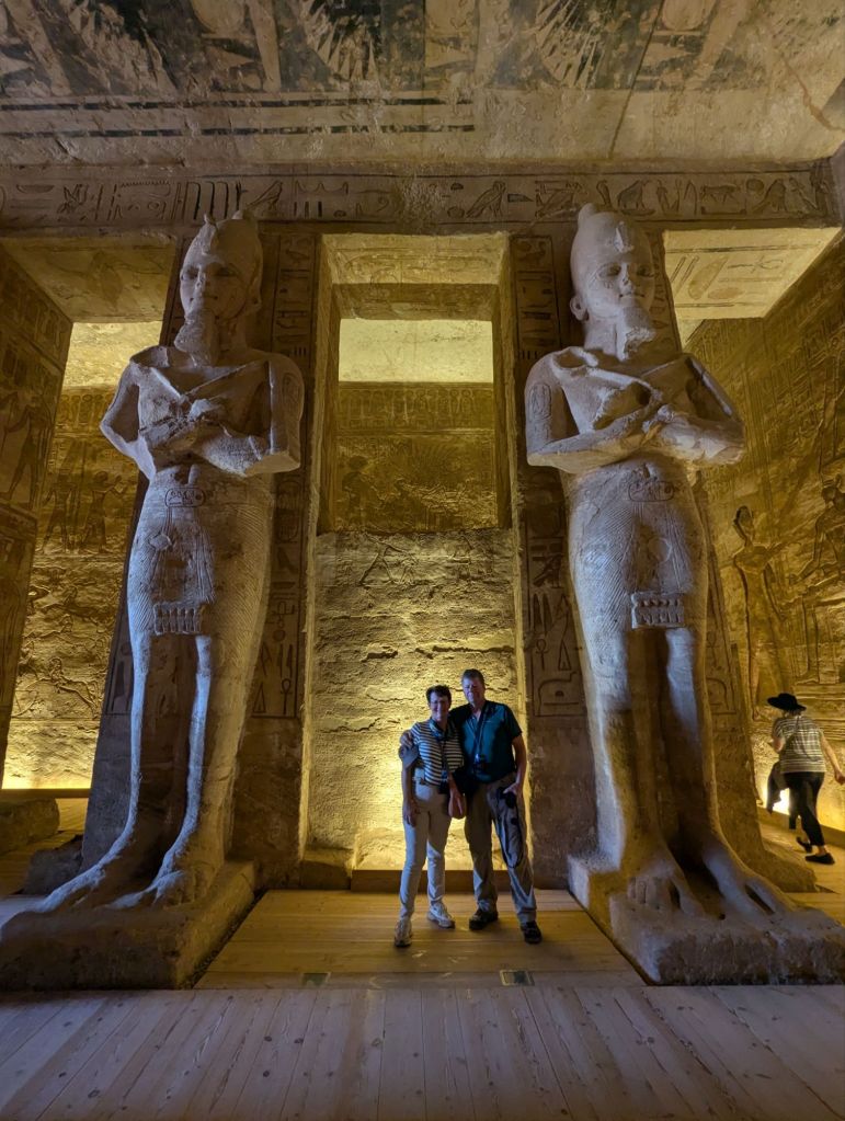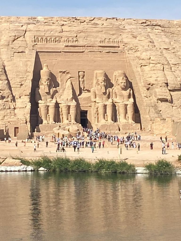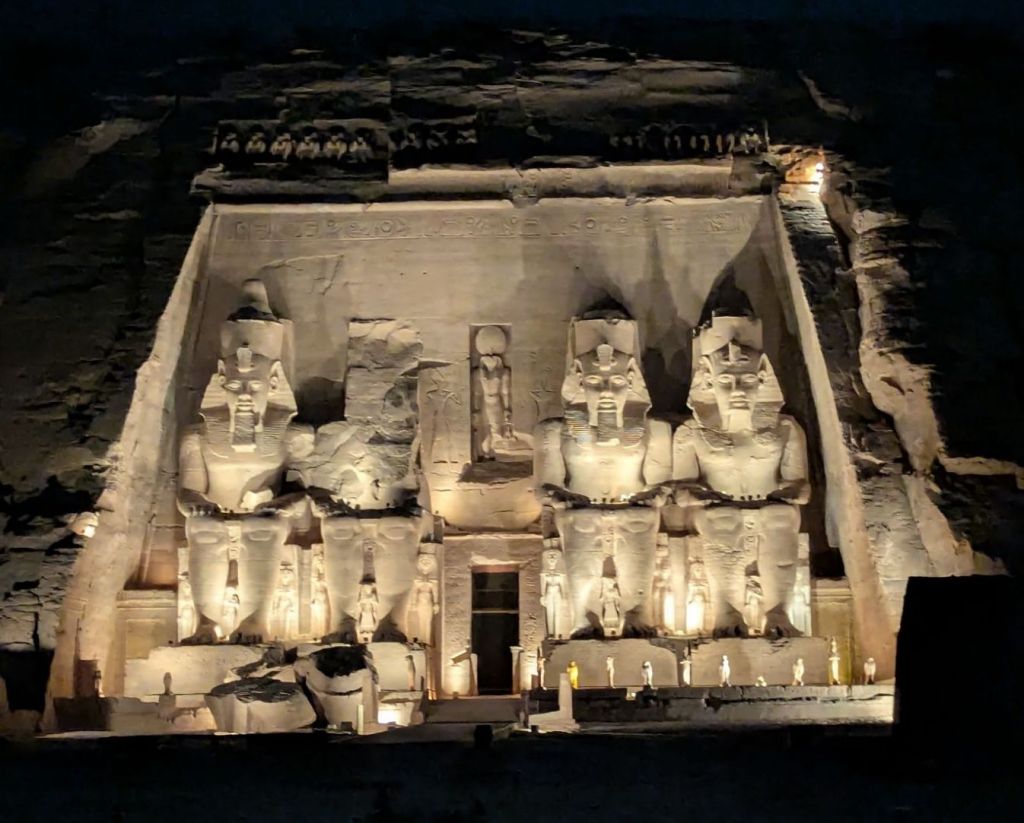 Eventually a mirage appeared as the town of Abu Simbel on Lake Nasser. Sand colored houses and a few businesses lined the streets. We headed directly to the site that is the Abu Simbel temple, built in 1260 BC. Pharaoh Ramesses II, who reigned 60 years 1279-1213 BC, built many temples to himself and even more monuments to honor his gods and, conveniently, also himself. Here in Nubia, Abu Simbel commemorated his defeat of the Syrian Hittites at Kadesh. These amazing, absolutely amazing, structures were carved into the rocky hillside and have colossal statues guarding the entrance. Each statue is 60 ft tall, their smiles are 3 ft wide. In typical Ramesses II style he equated himself with the deities. Here he guards the entrance in god-like glory. The interior rooms are richly decorated with colorful carved hieroglyphics detailing his battle successes with more accolades to himself as well as offerings to the gods who supported him. Two days a year sunlight hits the most interior room highlighting, you guessed it, another Ramesses’ statue seated with other gods.