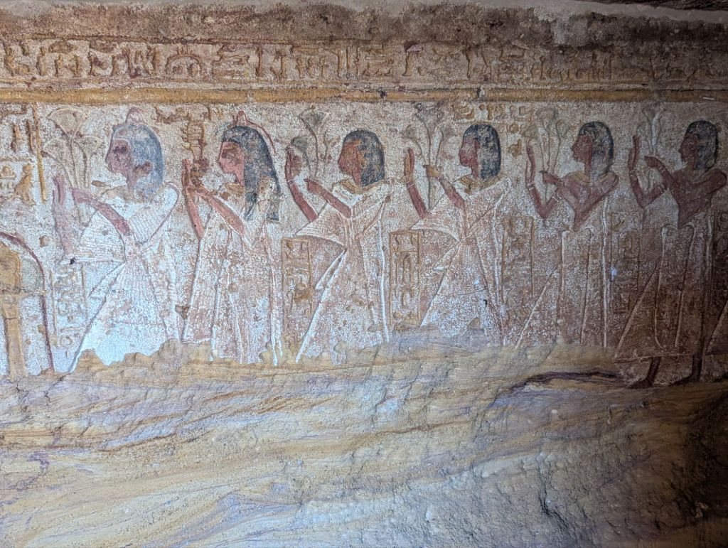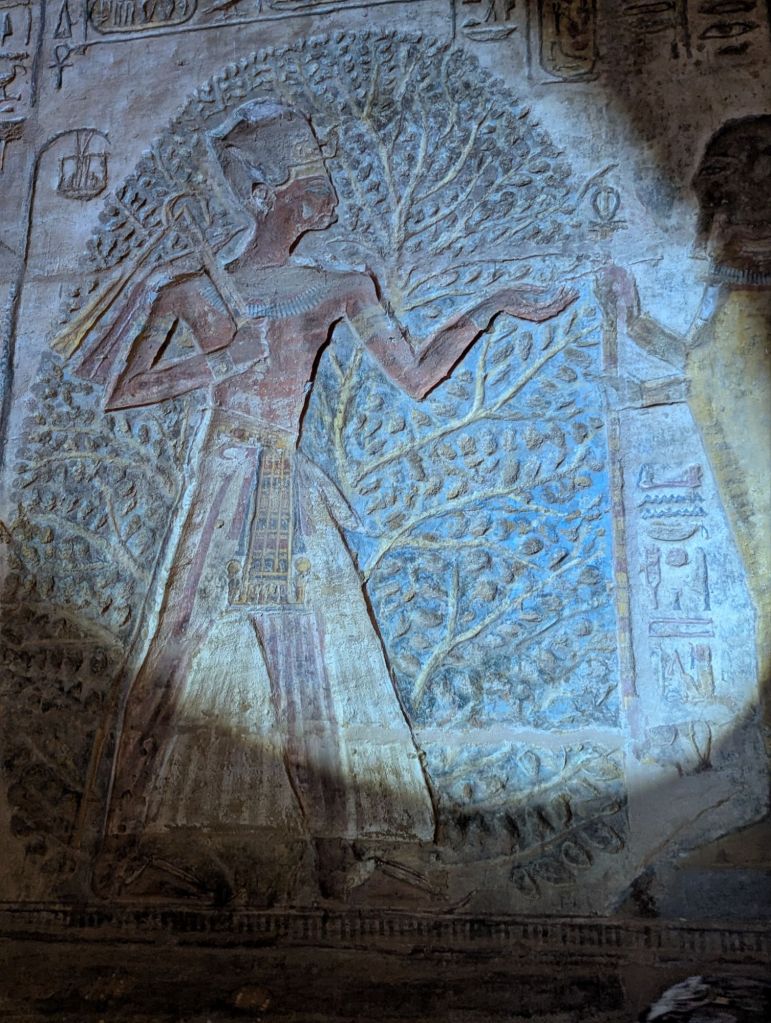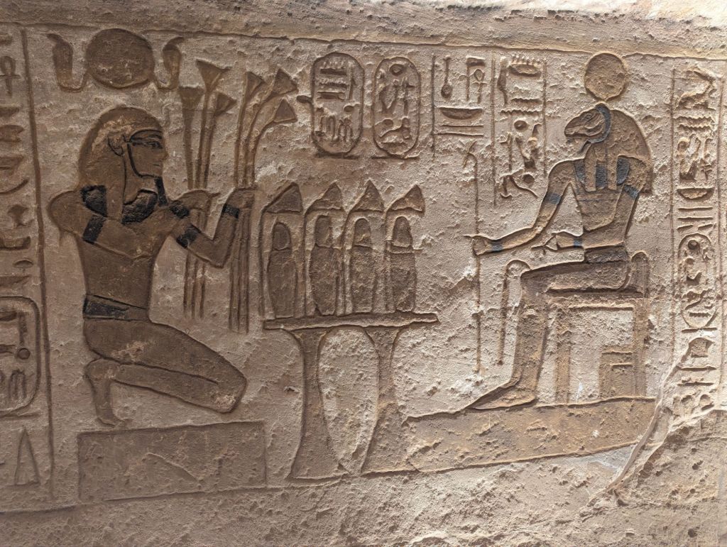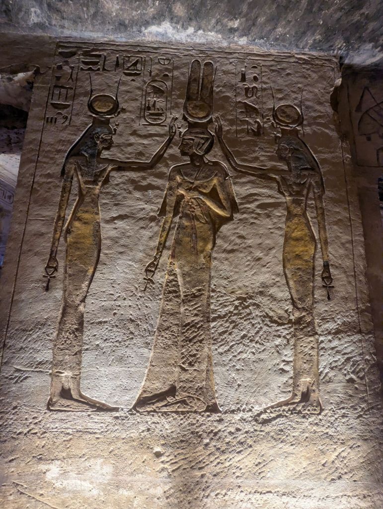Eventually a mirage appeared as the town of Abu Simbel on Lake Nasser. Sand colored houses and a few businesses lined the streets. We headed directly to the site that is the Abu Simbel temple, built in 1260 BC. Pharaoh Ramesses II, who reigned 60 years 1279-1213 BC, built many temples to himself and even more monuments to honor his gods and, conveniently, also himself. Here in Nubia, Abu Simbel commemorated his defeat of the Syrian Hittites at Kadesh. These amazing, absolutely amazing, structures were carved into the rocky hillside and have colossal statues guarding the entrance. Each statue is 60 ft tall, their smiles are 3 ft wide. In typical Ramesses II style he equated himself with the deities. Here he guards the entrance in god-like glory. The interior rooms are richly decorated with colorful carved hieroglyphics detailing his battle successes with more accolades to himself as well as offerings to the gods who supported him. Two days a year sunlight hits the most interior room highlighting, you guessed it, another Ramesses’ statue seated with other gods.