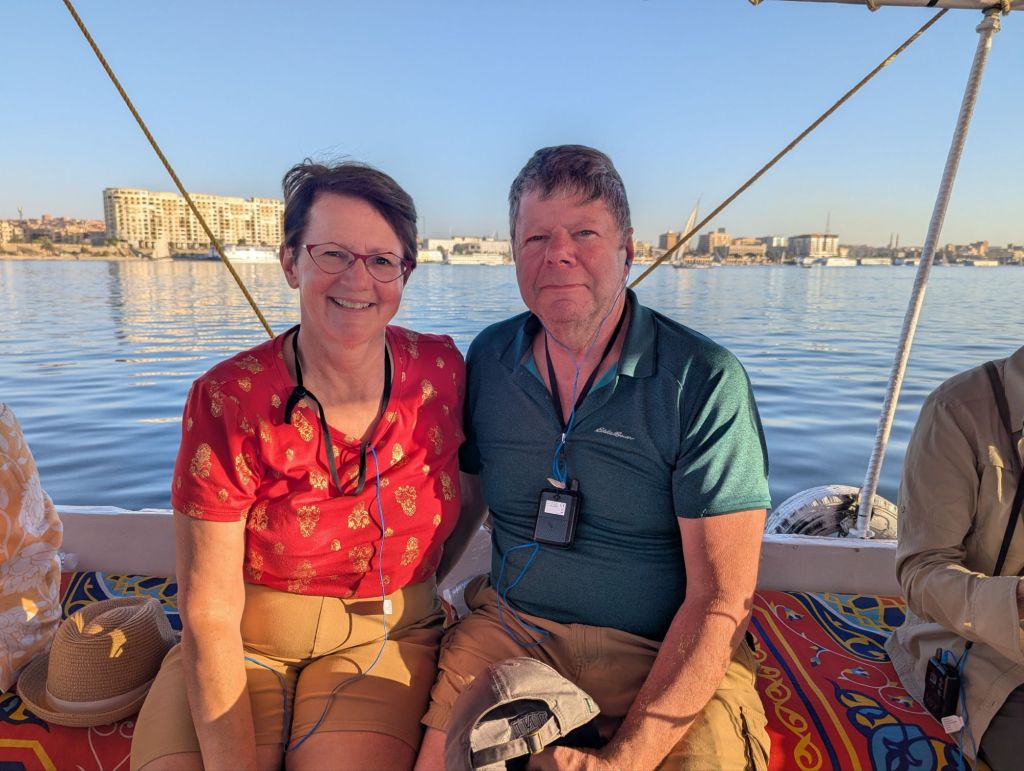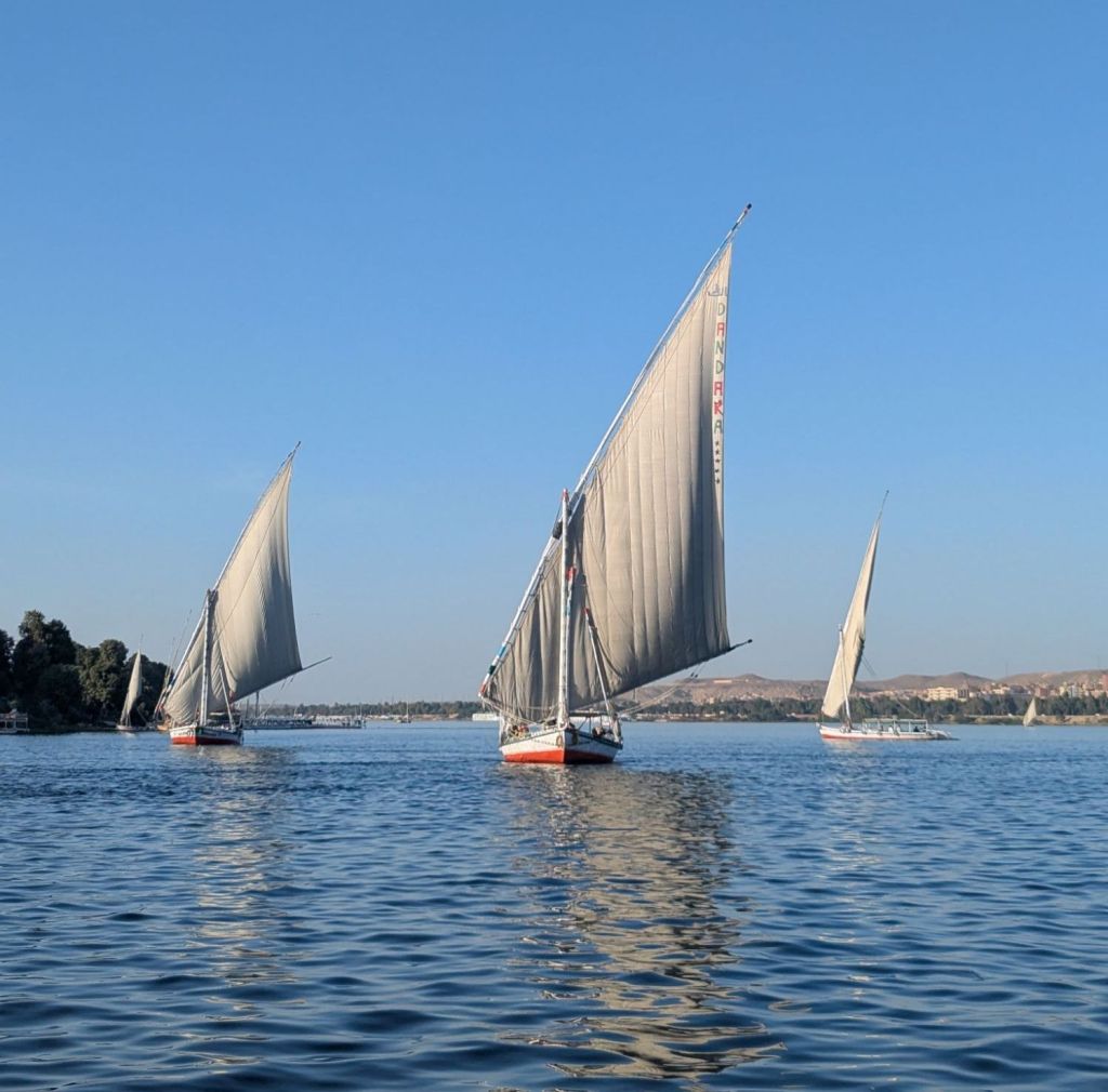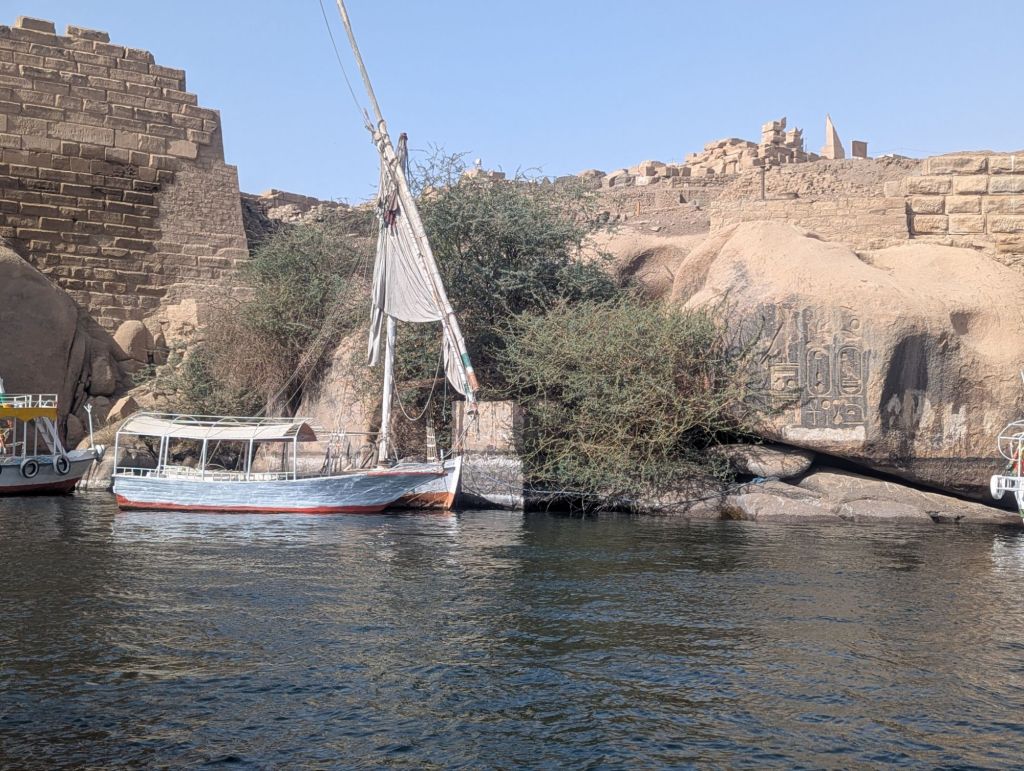 Our next lodging was a river cruise boat, the Amwaj. We settled in for a bit then headed out for a treat: an evening sail in a felucca, an Egyptian sailboat, on the Nile. Sun set as we sailed between Aswan and Elephantine Island and then the Nubian West Bank. A few caves and tombs were evident in the distant hills. The sail was lovely, though the wind died so we were towed back to port. The maneuvering of tour boats, feluccas, and even cruise ships as they crowded the city’s shore was remarkable; pushing in and away, squeezing in, or lining up side by side for access to the dock. All with smiles and friendly calls and helpful shoves, if not suggestions.