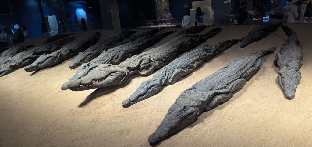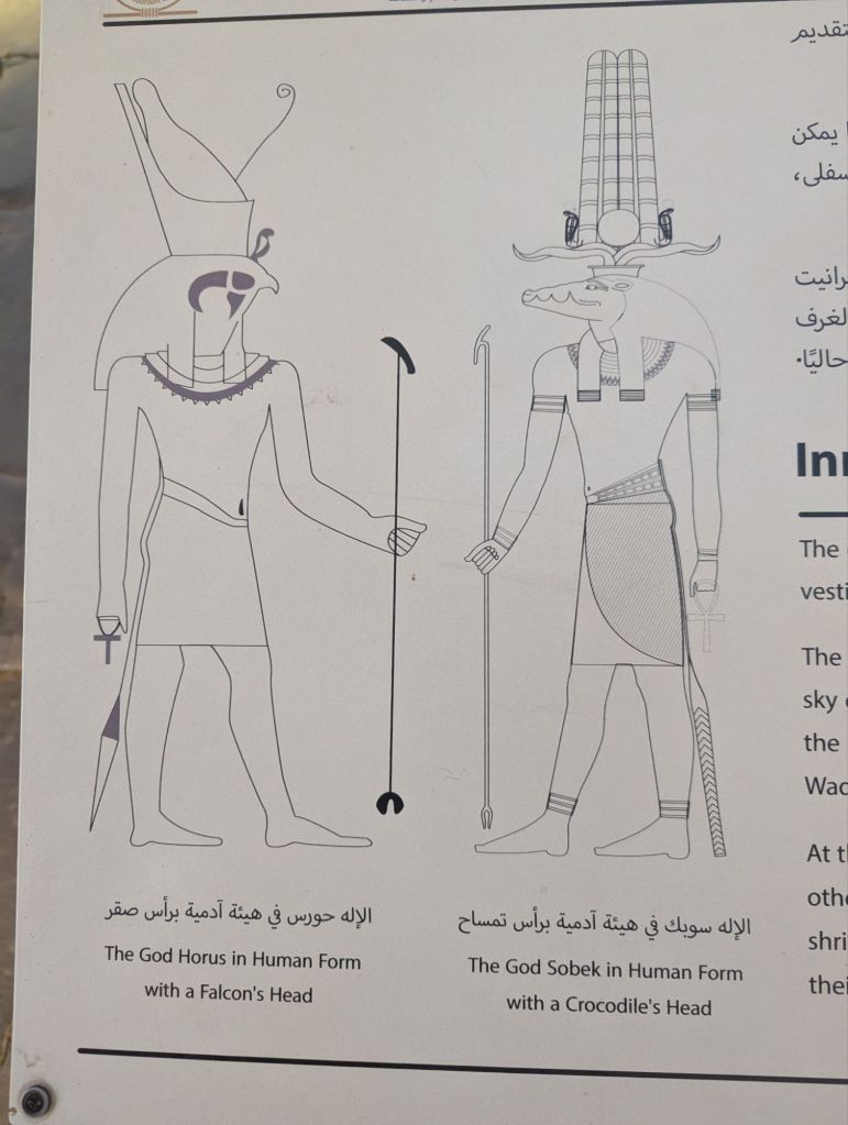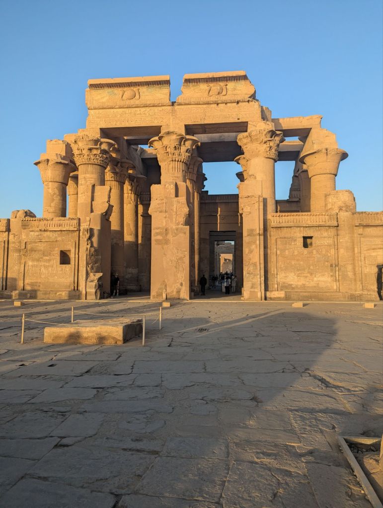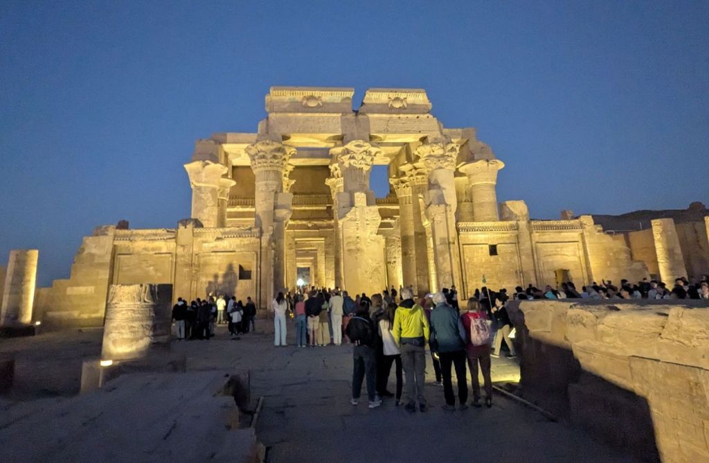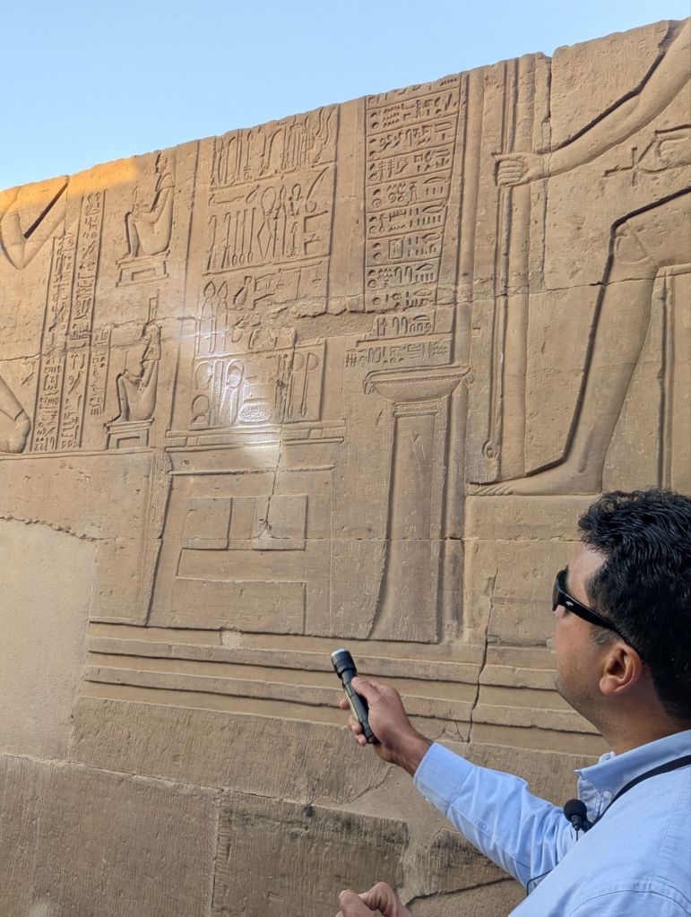 The next day we took an early morning motorboat nature cruise through the islands just below the English dam, the water moving fast through rapids. Young boys paddled up alongside our boat on stand up paddle boards to sing for money. Nubian homes lined the shore, fishermen cast nets, school children were being ferried to town for school. Aga Khan’s tomb stood watch atop a tall dune. We visited the Nubian family and returned to our boat for a relaxing afternoon (in my case, a massage). That evening, we visited the temple of Komombo, a double temple from the Greek and Roman times 181 BC, dedicated to Sobek, a crocodile god of evil, and Horus. Although very crowded due to all the cruise ships visiting and all on a similar schedule, Ayman, our tour manager, perfectly timed our arrival for us to see the only known hieroglyphics to show medical equipment without crowds.