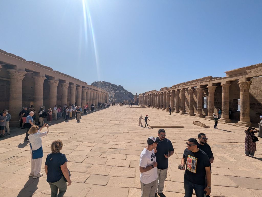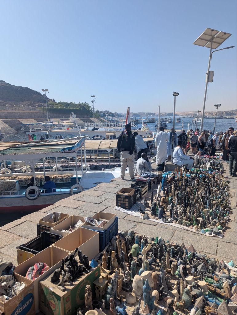 This side of the dam was considerably busier: Aswan is a popular resort destination. Philae is on an island so there were hundreds of boats ferrying hundreds of tourists back and forth from the temple just to run the gauntlet of vendors stationed back on the dock. From here on to the end we’ll encounter a sea of tourist and vendor humanity.
