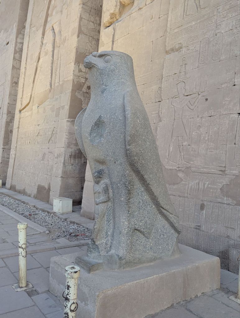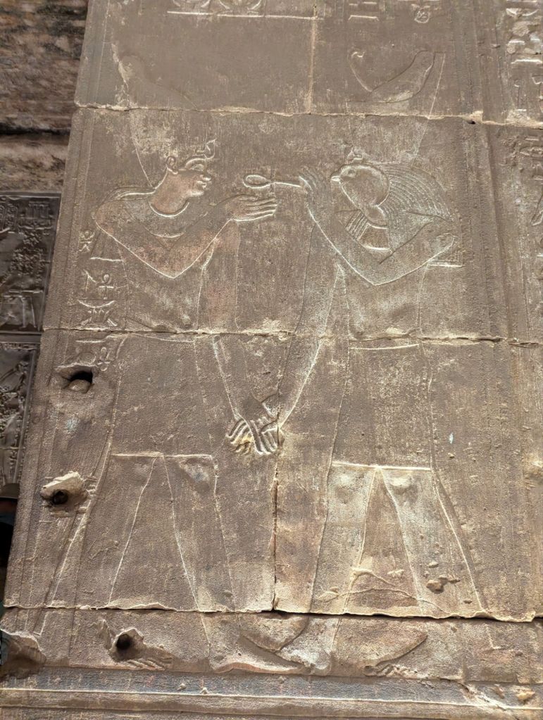 A very early morning (6:00 am) found us entering the Temple of Edfu in the impoverished town of Edfu, about halfway between Aswan and Luxor, our eventual destination. Many horse-drawn carriages lined the narrow streets to take tourists from the shops to the site. The horses looked malnourished and ill cared for. We bussed it and although the entrance line was very long it moved rapidly. The Temple of Edfu is huge with more beautiful carvings. Built in 237 BC, Edfu is dedicated to Horus. He is seen wearing the double crown of Upper and Lower Egypt, with his wife, Hathor, who has the eyes and ears of a cow. Ten rooms surround the sanctuary which holds a replica of a wooden boat. The boat is a symbol of life and death and serves to carry souls to the afterlife. The original boat from Edfu is in Luxor. Carvings higher up were defaced by the early Christians but, remarkably, lower ones were intact. This was due to the temple being buried in sand about 1/2 way up and not rediscovered until 1860.