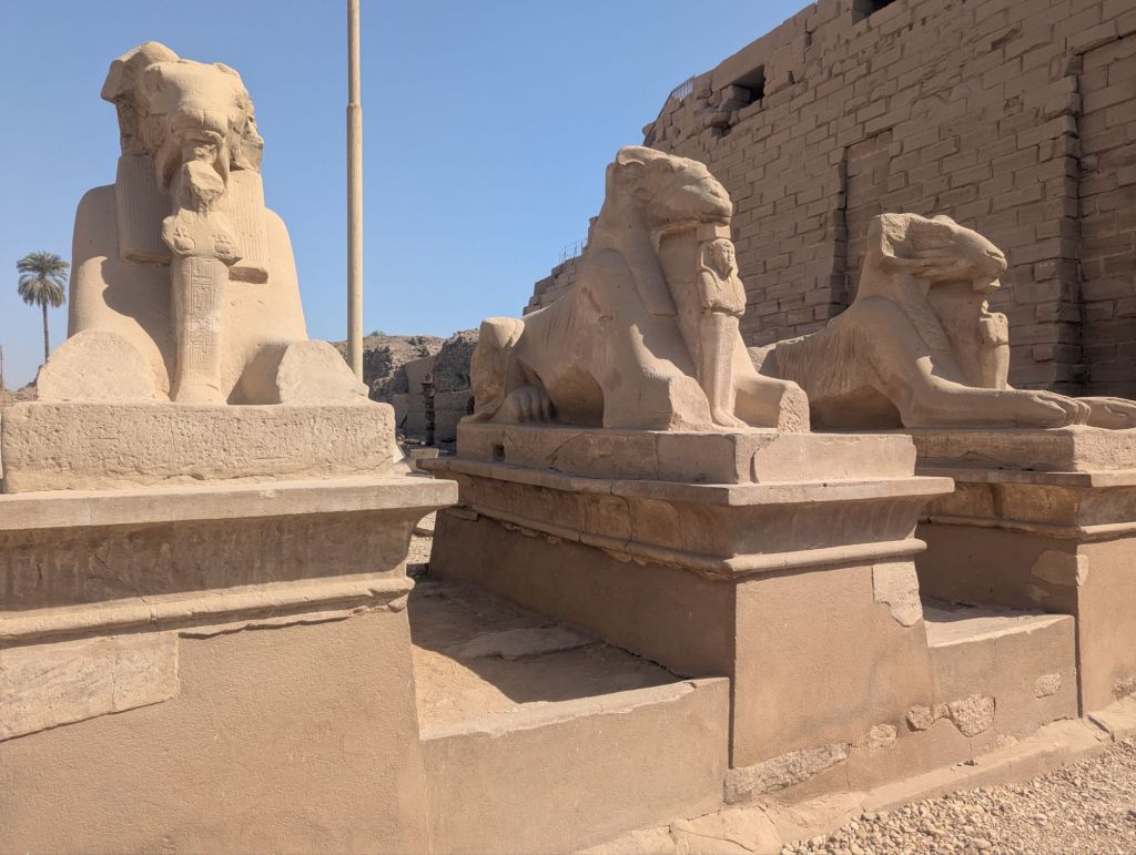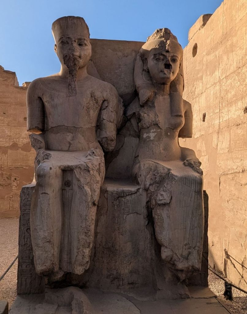 Ah, Luxor! Capital of Ancient Egypt for 500 years (1500-1000BC), land of the pharaohs, known as Waset in ancient Egypt or Thebes in Greek. We docked at this city of 1.5 mil population for an overnight before moving to our hotel, the Steigenberger Nile Palace. Our first visit was the temple of Luxor, continuously built since 1400 BC and added onto by successive pharaohs and kings: Amenhoptep, Tutankhamun, Ramesses II (he was everywhere!), and even Alexander the Great contributed. Luxor temple was also buried in sand and not discovered until 1949; houses, stables, and even a 700 year old mosque were built on top. The mosque is still there! Statues of King Tut and his affectionate wife grace the courtyard. Alex the Great built a sanctuary within the original sanctuary to prove his point. A magnificent avenue flanked by over 1,000 stone sphinxes stretches 2.7 km to Karnak.