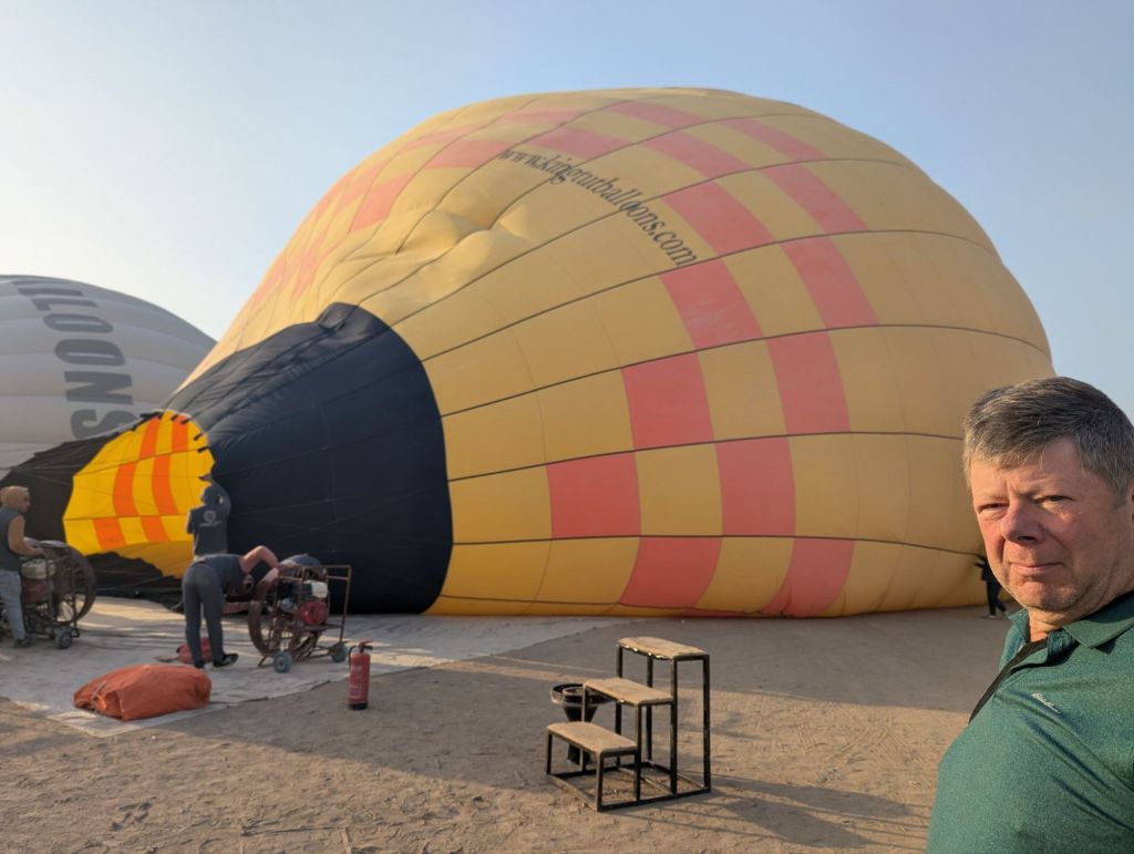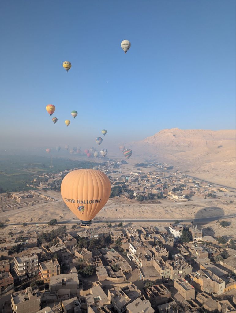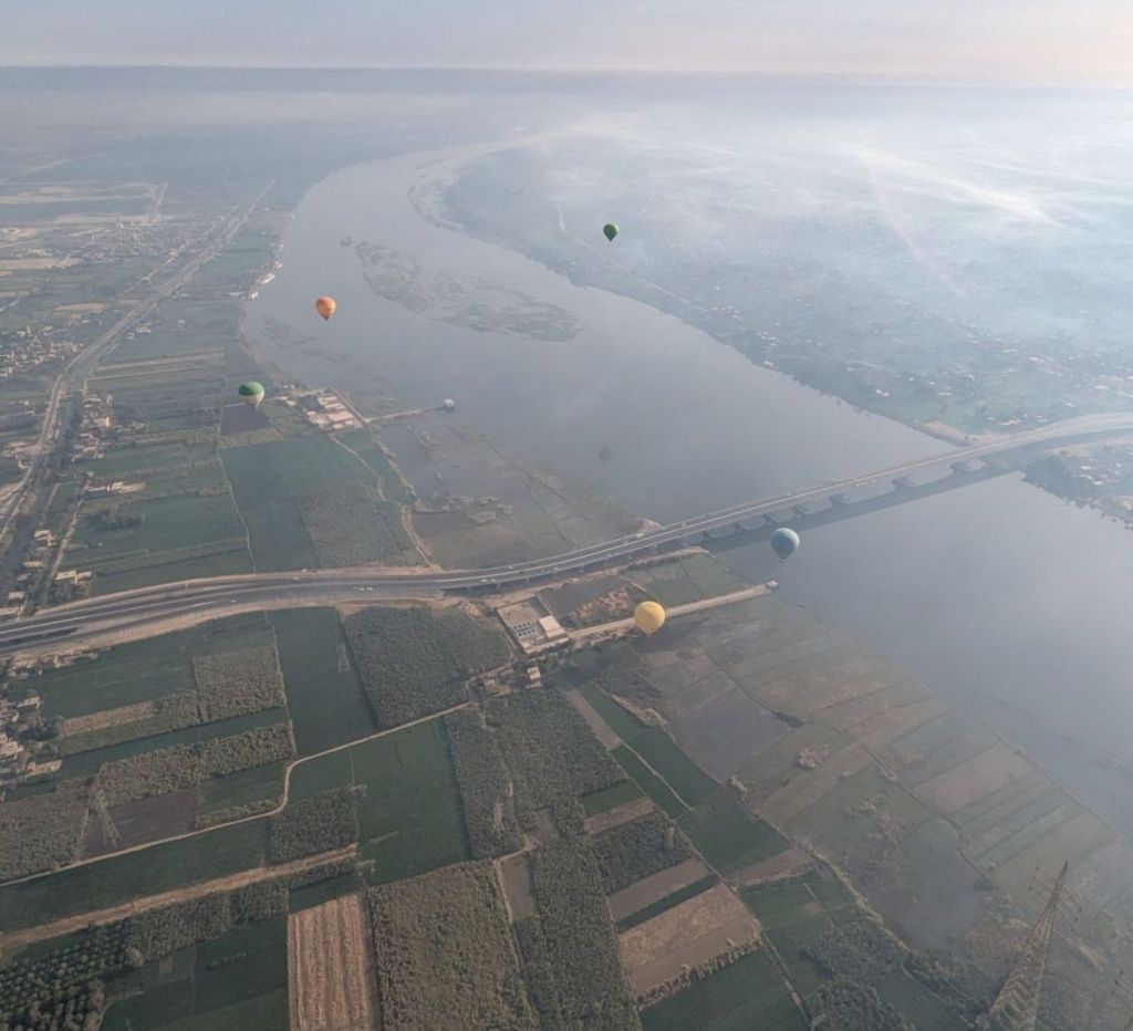 A trip to Luxor would be incomplete without a balloon ride! The intent was to fly over the Valley of the Kings but the winds were not cooperative. We were lucky to fly at all since local farmers were burning their harvested sugar cane fields making the skies hazy and unsafe. Eventually, after a 1.5 hour delay, there were shouts and applause and a quick scurrying of men who then got the balloons up, up, and away.