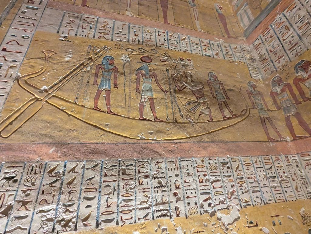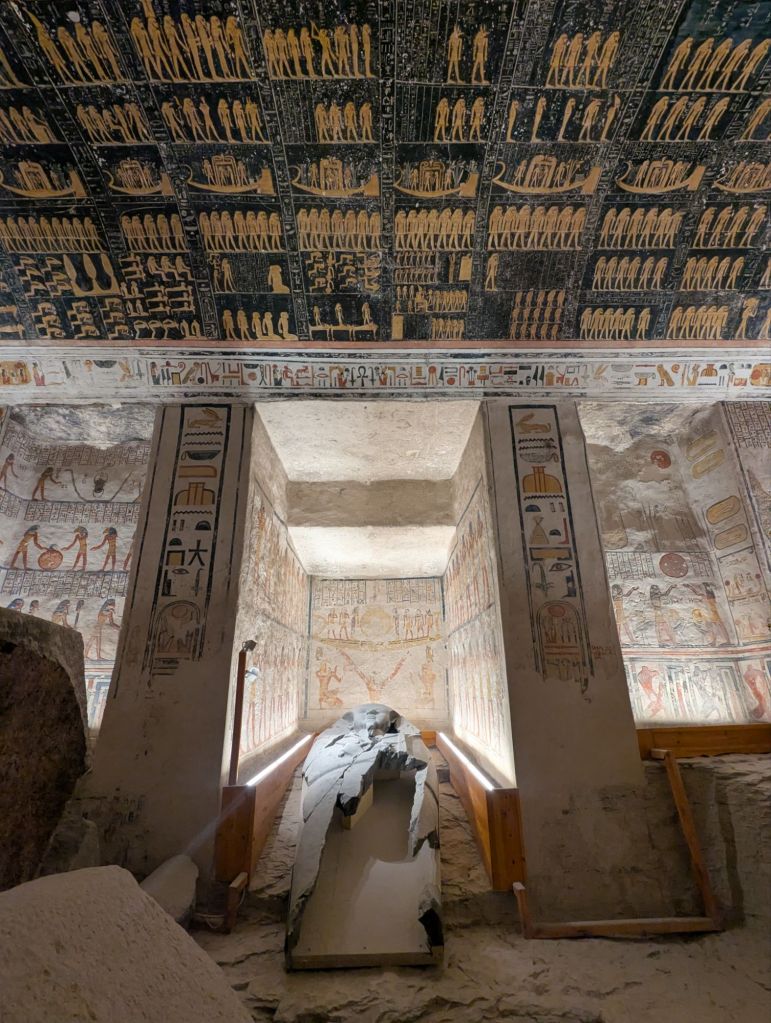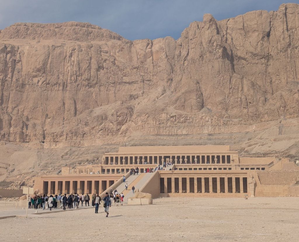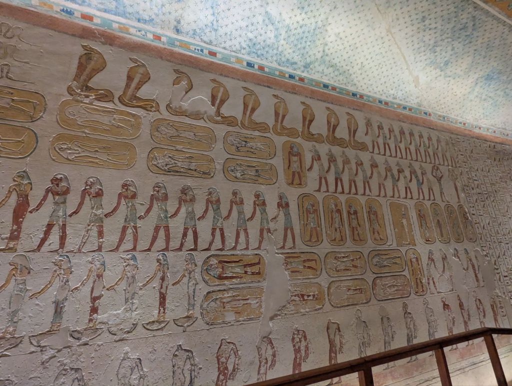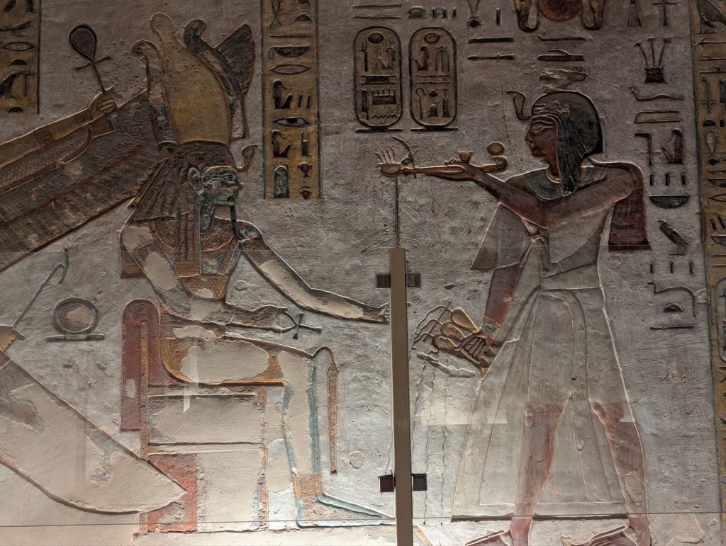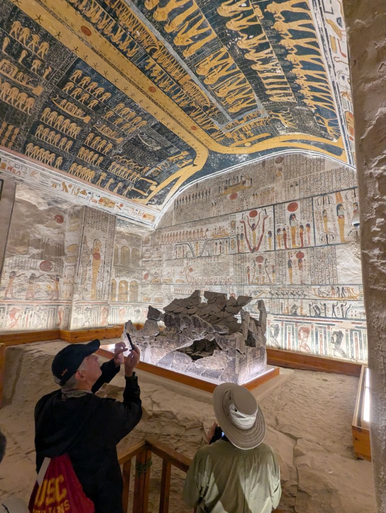 Another day, another highlight! We headed to the West bank very early the next morning to visit the Valley of the Kings. Here, pharaohs of the golden age (1500-1000BC) were buried in ornately decorated tombs. Over 60 tombs of 3 royal families are located in this barren valley surrounded by hills, notably the tallest peak in the shape of a pyramid. Our early arrival meant for lighter crowds. We entered the tombs of Ramesses III, Ramesses IV, Ramesses V/VI, and Tutankamun. Also the double tomb of Tausert tomb usurped by Setnahkt.