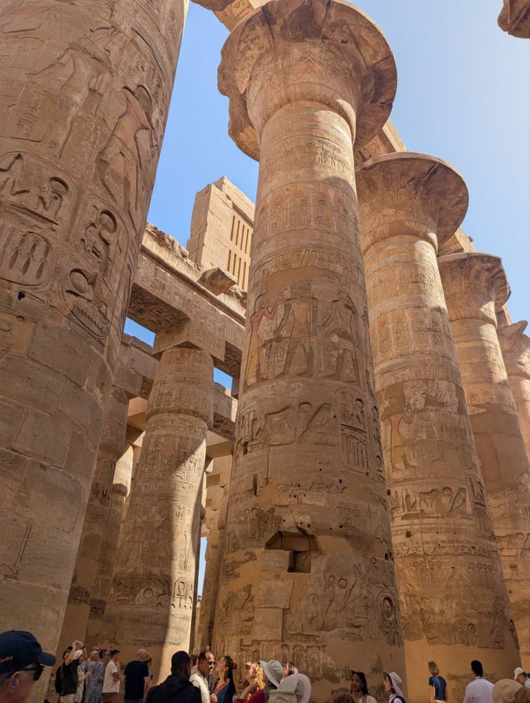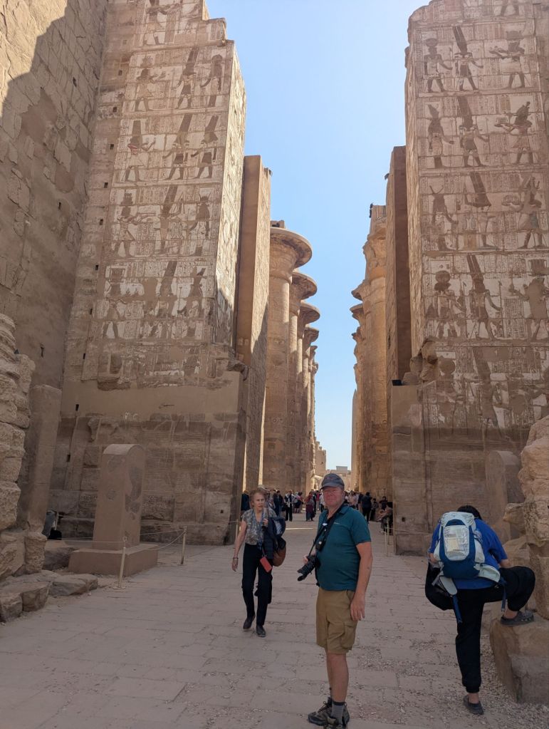 Karnak, connected to Luxor Temple by the Avenue of Sphinxes, is a 62 acre religious complex dedicated to Amun Ra, the chief deity, and his wife Mut. Pharaohs left their mark here through the ages. Sphinxes with heads of a ram line the entry to the temple, representative of Amun Ra’s power and fertility. The Hypostyle hall, built around 1290 BC, is a large room with many pillars holding up the roof, and it is magnificent. There are 134 immense pillars, like a forest of huge granite trees, each carved and decorated beautifully ranging from from 46 to 79 feet tall. The tallest obelisk in Egypt was built by she/he pharaoh Hatshepsut from a single piece of granite and erected after only 7 months! Later it was enclosed with large bricks by her stepson after her death. He couldn’t bring himself to deface or destroy the obelisk decorated with carvings representing the gods, so he covered it up. There are so many interesting stories from ancient Egypt, luckily we had a studied Egyptologist, Ayman, explaining them to us.